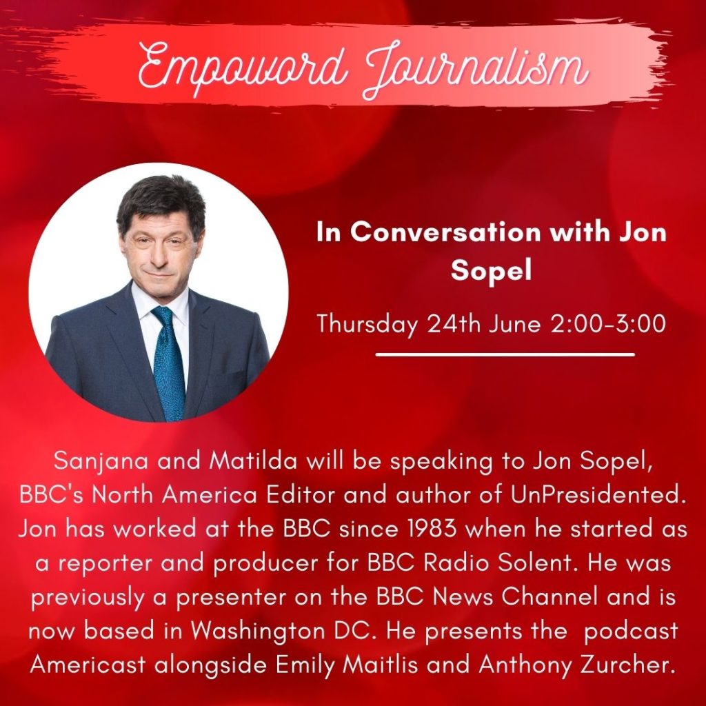 On Thursday 24th June, Opinion Editor Sanjana Idnani and Current Affairs Editor Matilda Head sat down with the BBC’s North America Editor Jon Sopel. This episode of Empoword’s ‘In Conversation With…’ series saw Jon offer many pearls of wisdom from his immensely successful career, with topics ranging from the hard hitting realities of reporting in a warzone to starting a podcast in a global pandemic.